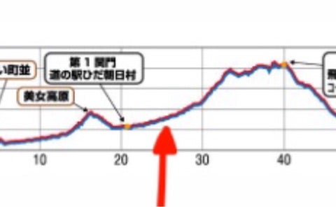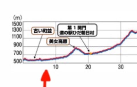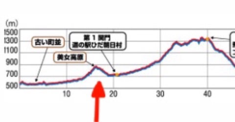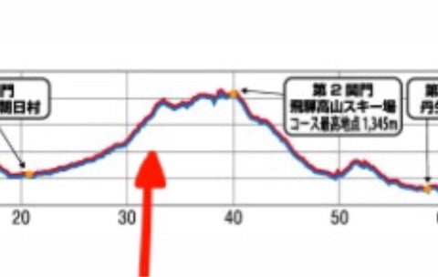 30〜40kmは最高点の1345mにむけて一気に約400m駆け登る区間です。